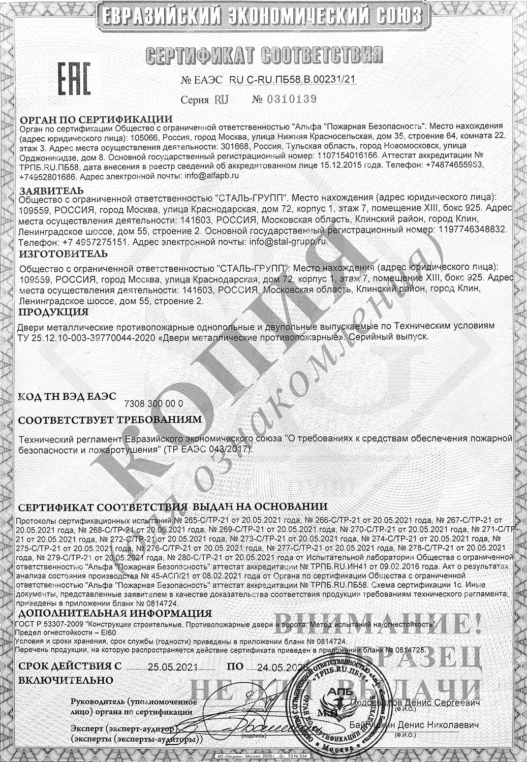 Класс огнестойкости: EI 60 (EIW). Время до потери целостности при пожаре не менее 1 часа.