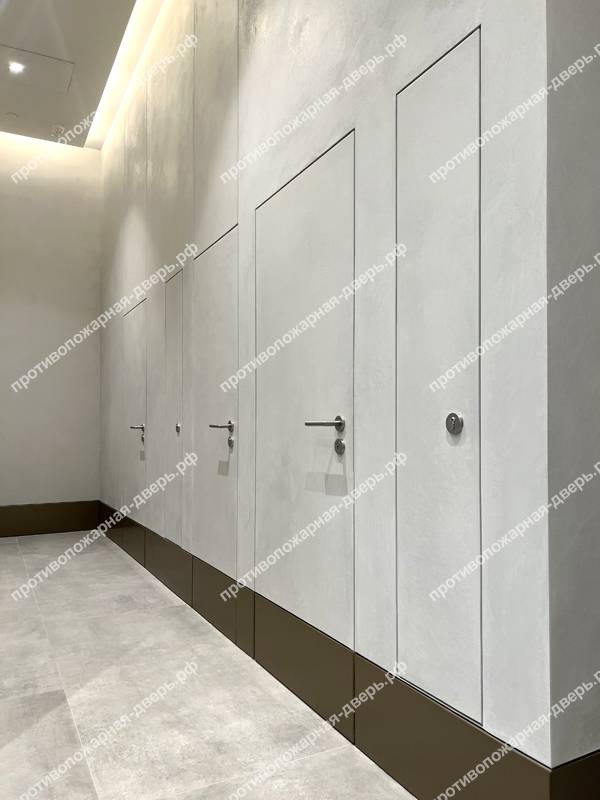 Противопожарные двери скрытого монтажа изготавливают из стали, с использованием негорючей теплоизоляции и специальных уплотнителей по периметру створки. Двери соответствуют требованиям пожарной безопасности, их установка разрешена в зданиях с большим количеством людей и интенсивным трафиком, в том числе на путях эвакуации.